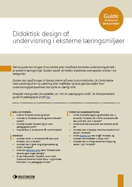 Guiden er udviklet på baggrund af en fælles erfaringsopsamling i Skoletjenestens studiegruppe om didaktisk design i eksterne læringsmiljøer i perioden 2022-24.