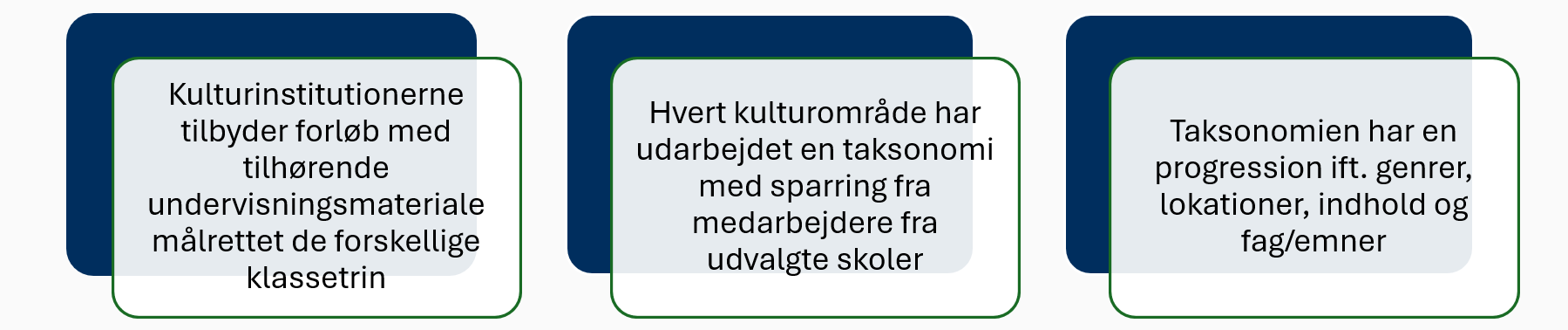 Disse institutioner er udvalgt til at levere kulturtilbuddene og skabt taksonomien i samarbejde med Skoleafdelingen og Kultursekretariatet: