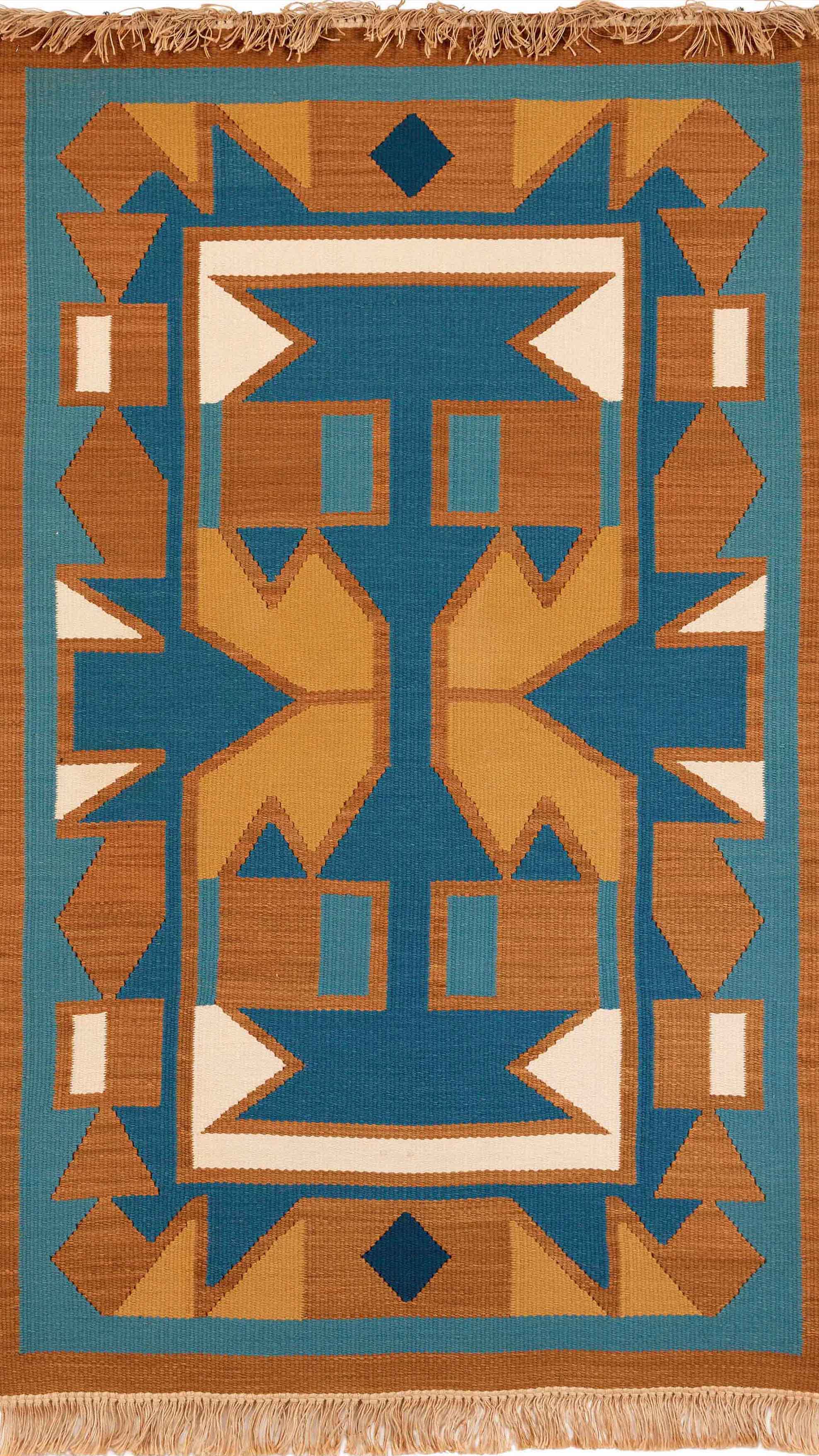 Anna Thommesen, "Blåt-brunt-hvidt", 1952, vævning, plantefarvet uld, 183 x 117 cm, Holsebro Kommune Rådhuset, © Anna Thommesen. Foto: Ole Mortensen